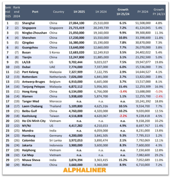 Top 30 Global Port Throughput in H1 2025